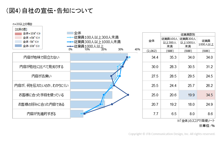 4.自社の宣伝・告知、3割以上が「内容が地味で目立たない」「内容が他社に比べて見劣りする」。