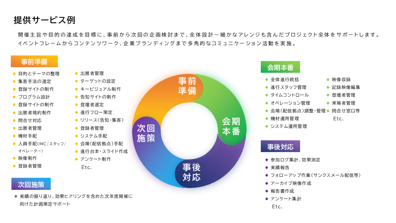 製薬・自動車・IT・金融業界様をはじめとした、あらゆる業種・業界への豊富な実績とノウハウをもとに、集客をはじめとした参加者とのコミュニケーションプラン策定~各種KPIの設定~運営・進行~事後検証~次回への提案までをトータルにデザインします。